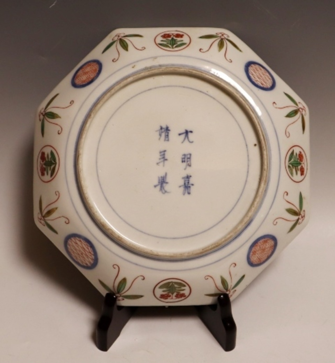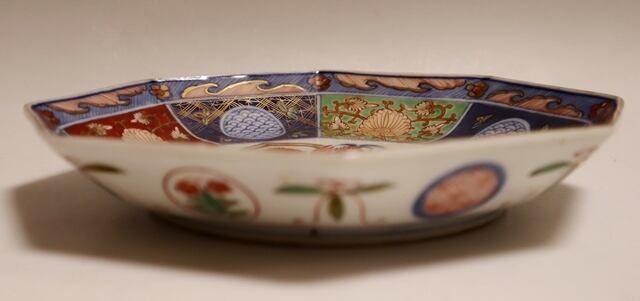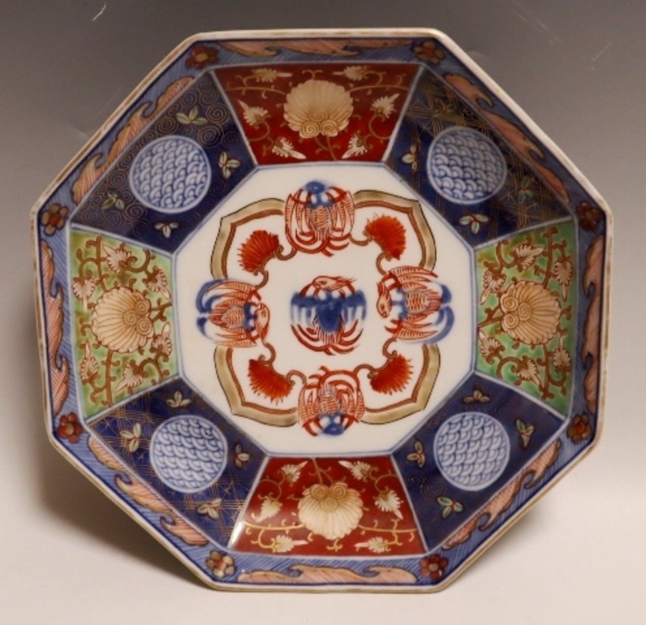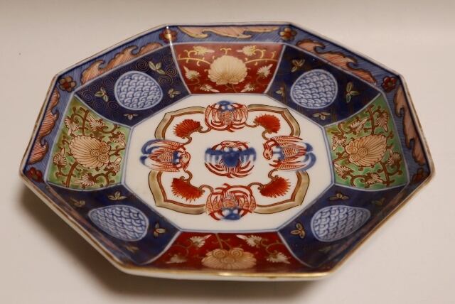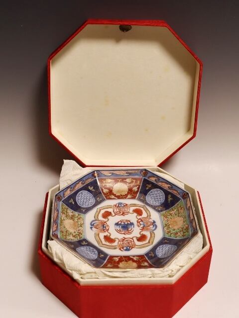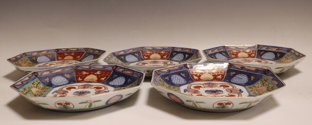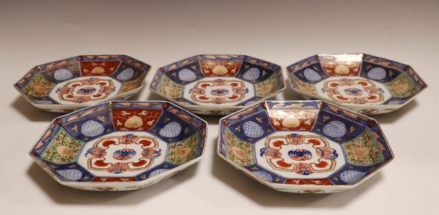 商品説明・古伊万里染錦八角七寸皿 5枚 布箱有
