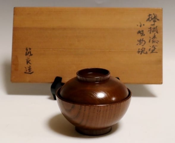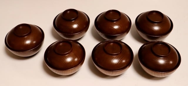商品説明・筑城筑良造(山中塗) 﨔拭漆塗小吸い物椀 7客 箱あり