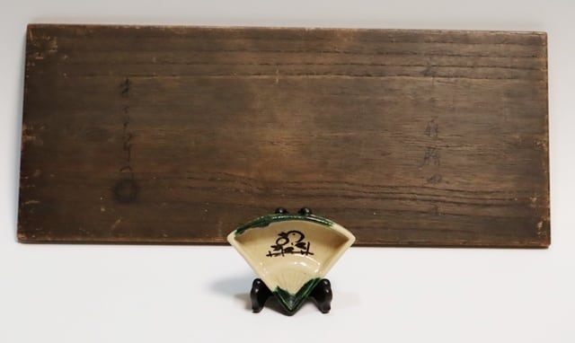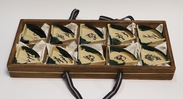 商品説明・楽13代惶入造 織部薬色分扇面絵皿 10客 共箱