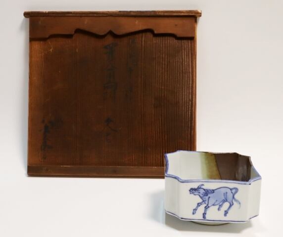 商品説明・永楽善五郎造 染付半柿牛之図 四方向う付 5客 共箱