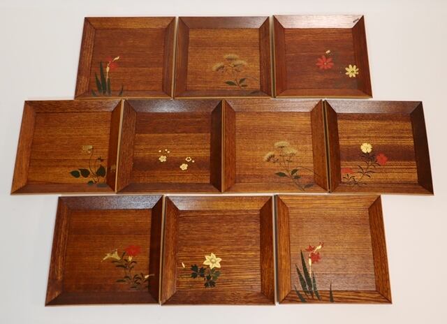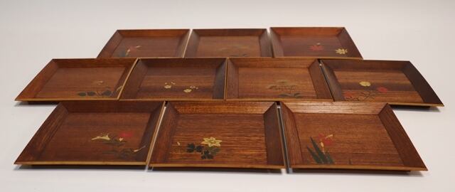 商品説明・楽全造 春慶塗絵変 四方菓子盆 10客 共箱