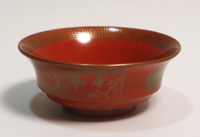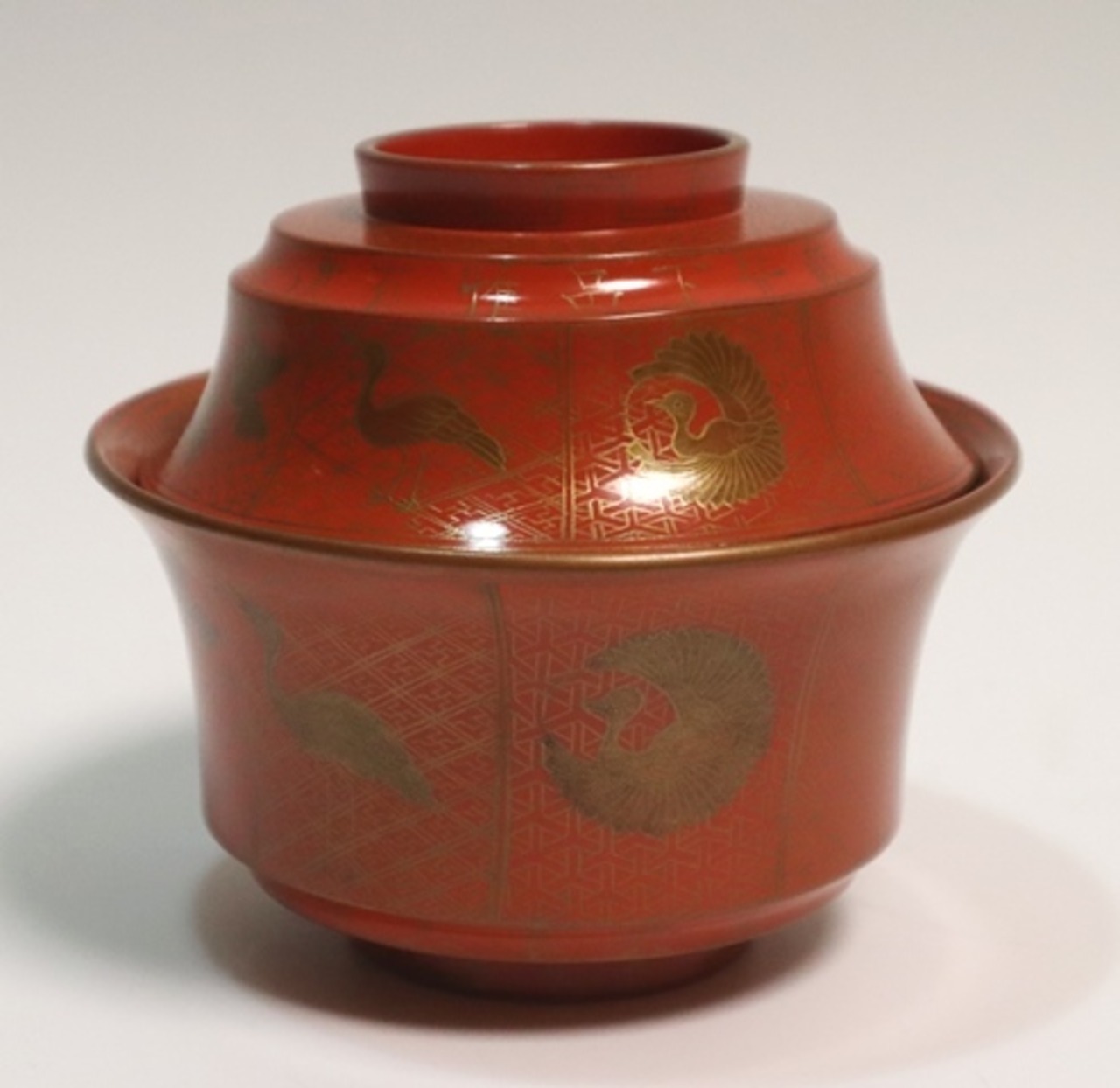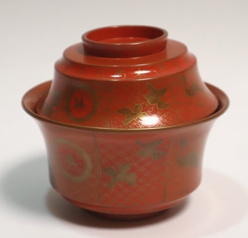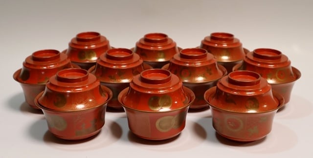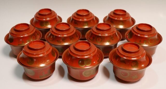 橘屋友七造 朱塗鶴小紋蒔絵吸い物椀 10客